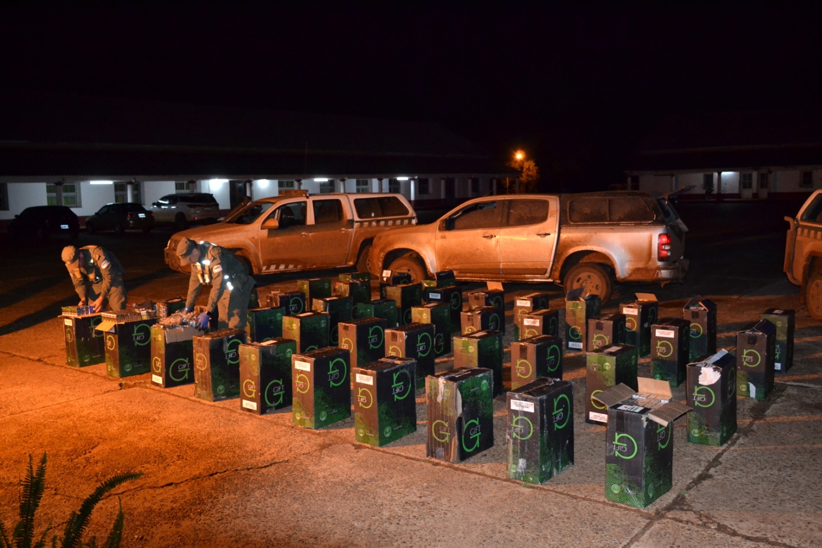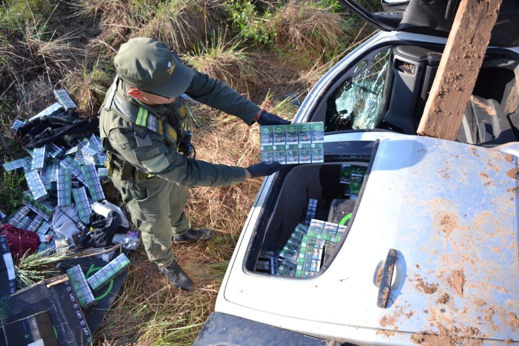 Tras realizar rastrillajes en el sector y zonas aledañas, los funcionarios procedieron a la inspección del vehículo y constataron que trasladaba 43 cajas de cigarrillos de origen extranjero.