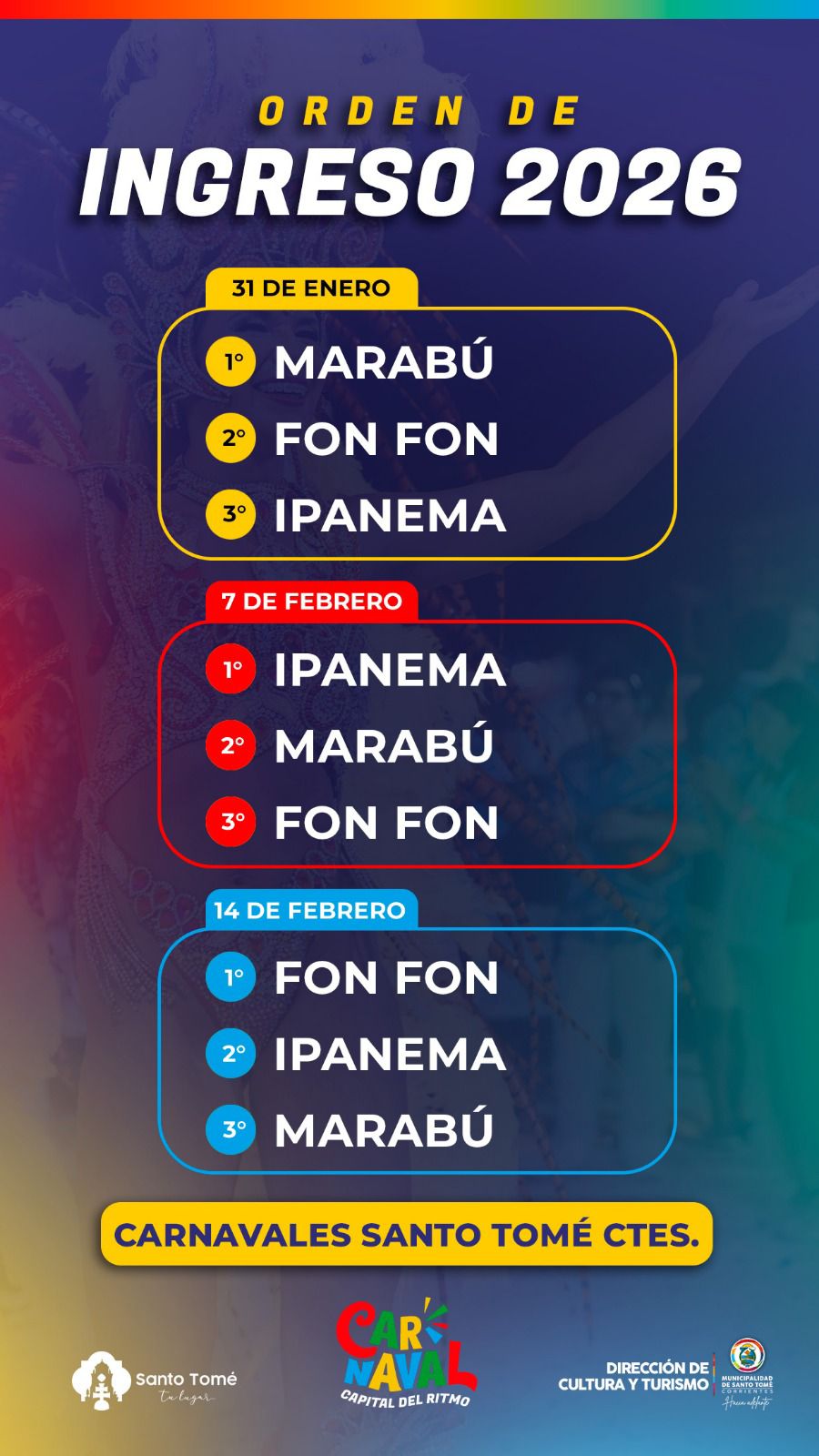 SANTO TOME. La fiesta del Rey Momo ya ultima detalles para lo que será una edición más de una de las fiestas más convocantes de esta ciudad y que es la del carnaval, la que tendrá tres noches a puro ritmo en el escenario ubicado en la zona de los barrios del sur el próximo 31 de enero, continuará el 7 de febrero y culminará el 14 del mismo mes. Comparsa Marabú será la encargada de iniciar el desfile en la primera noche.