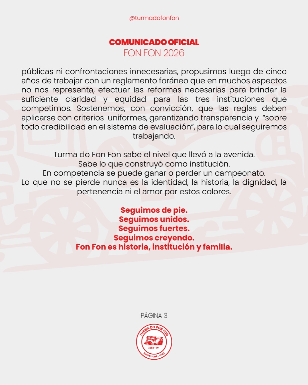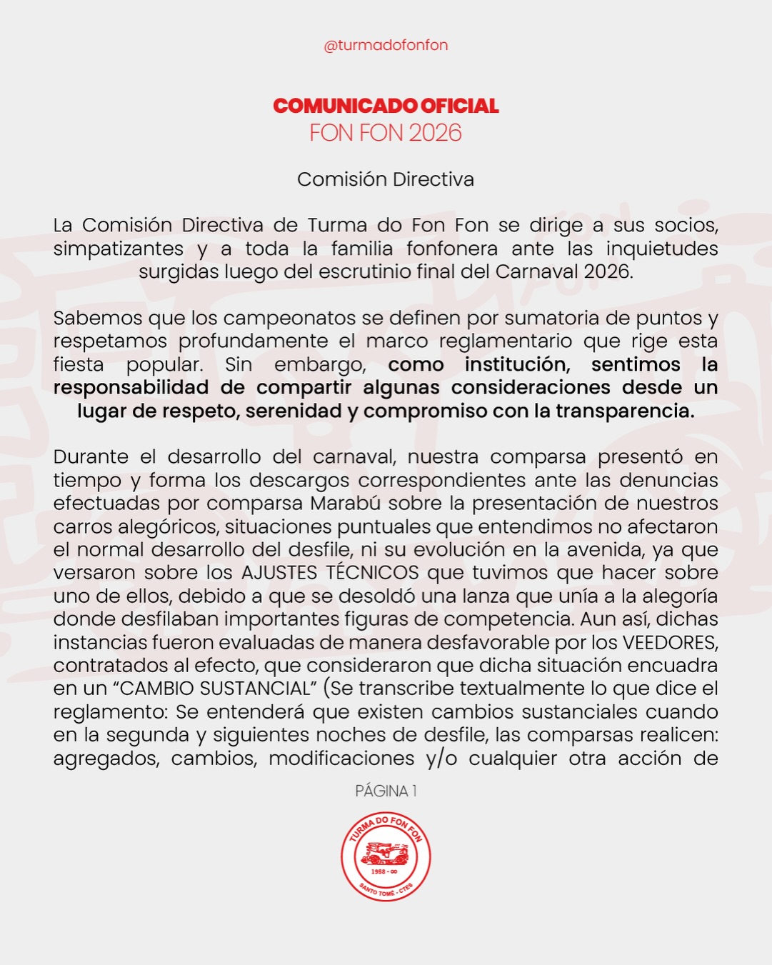 SANTO TOME. A una semana de haber culminado el corso en esta ciudad, la Comparsa Turma do Fon Fon emitió este sábado un comunicado oficial donde expone una serie de cuestiones ligadas al accionar de determinados jurados que actuaron en las tres noches de Carnaval. La misma se difundió por medio de las redes sociales.