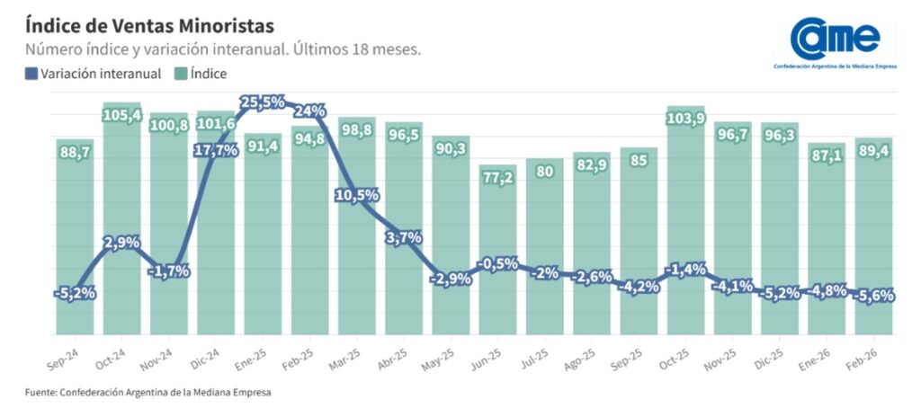 Según el relevamiento de ventas minoristas que lleva adelante la CAME a nivel nacional, en diciembre se confirmó la tendencia negativa que sufre el comercio, con una caída interanual del 5,2%. Sólo observando el último semestre del 2025, mes tras mes en las comparaciones interanuales se evidencia la caída y el retroceso. El análisis sectorial de diciembre confirmó la tendencia recesiva: seis de los siete rubros relevados finalizaron con números rojos. En ese marco, el 30 % de los comerciantes consultados aseguró haber empeorado respecto del 2024.
